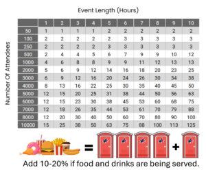 FOR EVENTS: To estimate the number of restrooms needed for your event, determine the total duration of your event. For multi-day events, use the longest single day. Next, calculate the guest count, considering the highest attendance day if applicable. Refer to the chart to determine the required number of portable restrooms.