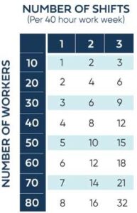 FOR CONSTRUCTION SITES: To calculate the number of restrooms needed for your jobsite, identify the number of shifts and the size of your workforce, especially during peak times. Use the chart to determine the restroom requirements for your project.